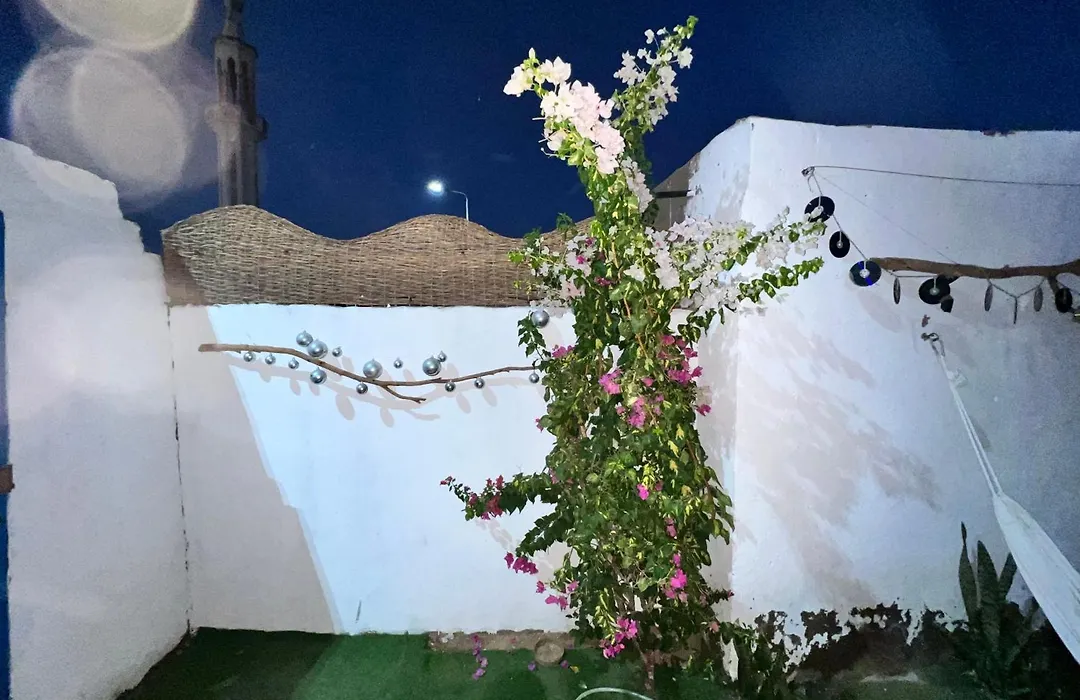 A propriedade de Dahab está equipada com chaleira elétrica, refrigerador e utensílios de cozinha para uma área de refeições ao ar livre.
